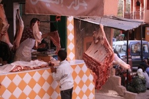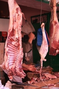 In most circumstances its difficult to tell sheep and goat meat apart, especially when they are covered in a thick Targine sauce. Morocco meat markets appear to have this sorted, carefully leaving a unskinned, untouched sheep head or goat head firmly attached to the respective carcass as its butchered up. Covered in flys and without the aid of refrigeration the meat soug (covered market) is a vegetarian dream. Bring on tonight’s lamb Targine and goat skewers. Yum.