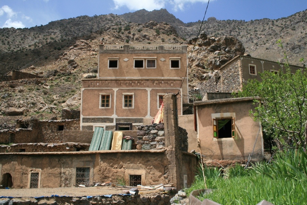 Emily : Our longest day in the minivan took us over the high Atlas Mountains with some great scenery, although the twisting road made quite a few of us carsick – and I could not find any ginger flavoured food or drink anywhere despite having HUGE gingers here! We arrived into a beautiful valley called Toubkal and followed the river to a small village at the base of North Africa’s largest mountain, Jebel Toubkal. With a big truck blocking the road, we were rescued by a couple of boys and their mules up the street a bit further. The Village was a mixture of raw rural life with the typical tourist shops filled with brightly coloured carpets, scarfs, jewellery, and of course half a cow hanging on the street corner at the local butchers surrounded by sheep and goat heads! It’s quite a popular place for tourists due to the great walking tracks and Moroccans to escape the heat of the summer. We walked for 1 hour up the mountain to an even smaller village called Armed which is accessed mainly by mules to transport people and supplies around the valley and mountains.