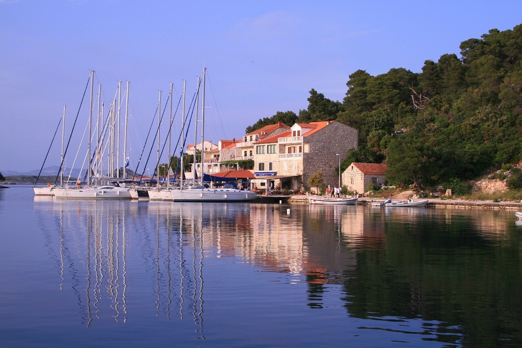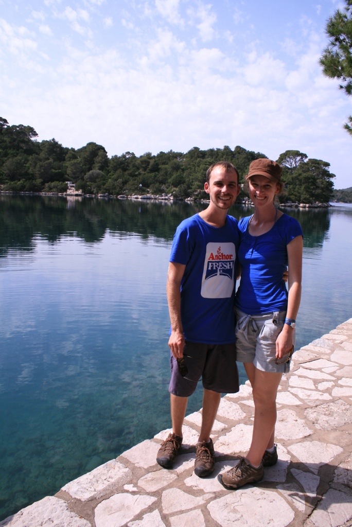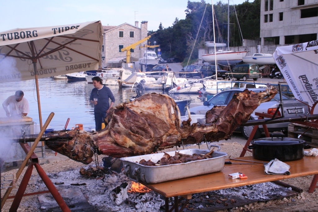 There are about 20 people on our cruise, a mixture of Aussies, kiwis, and a couple of French and English and one Canadian so quite a good mix. We left Split at 1pm after our first lunch which was average – overcooked soggy peas and potatoes and a meat patty, all of which were so salty it was physically hard to eat (felt sorry for the guy who had just told them he needed a low-salt diet). I’m glad to say the meals have improved since then! It was super hot on the boat so stopped for some diving off the boat – the water was about as warm as Lake Taupo in December but still so refreshing! Everyone was into their beers, cocktails and cool drinks that afternoon and we had a relaxed time socialising while lying round on the deck! We arrived at our first island Makarska around 6pm so didn’t get much time to explore. It was a cute port with other similar boats lined up side by side such that to get on land you had to cross each boat to get there. Down one end of the report was a huge bikers rally / festival, with hundreds of people in leathers and vests drinking beer around a portable bar and a HUGE cattle beast on a spit blaring loud music which lasted until the small hours – pretty cool with fire works later on as well. We managed a small walk out on peninsula to see the views and an old chapel, and found a ‘padlock fence’ with hundreds of padlocks attached – since then we’ve found heaps more on other island…I’m thinking we should contribute! That evening we splashed out on a nice seafood dinner with some of the others from the cruise, I had tuna steaks and Scott had calamari, both with fresh veges – it felt like the first normal dinner we had had in ages as had been eating either tagines, omelettes, pastas or pizzas until then.