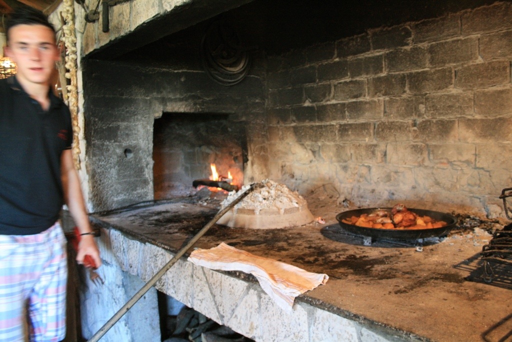 The next morning we decide to see if the weather has calmed down. Although its flat in the port, the weather apparently is too bad to go to the cave. Instead we decide to book a lunch at a local family restaurant in the hills surrounded by a vineyard. We see a few small inlets and towns along the way. Around a small cove we find a massive concrete structure, a submarine base that protrudes from the crystal clear blue water. Its a surreal experience walking down the concrete ramp into base. The secret tunnels and bunkers are a pretty amazing sight. Scooting off , we arrive at lunch at 1pm, ready for our weekly treat :). We had ordered a lamb roast cooked in a traditional style called ‘pecka’. It involves a ceramic dish covered in a ceramic cover, all covered in hot coals. It was amazing – washed down with a few wines. This was our meal treat for the week. All fuelled up we scooter home to catch the 3 pm ferry back to split.