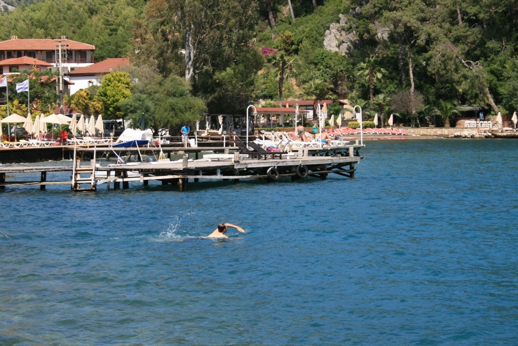 We ended up at a small bay close to Akyaka for lunch (cheap picnic lunch of sandwiches), Scott took a swim in freezing water, and we found a nice looking beach but it was covered in rubbish and owned by a pack of stray dogs, it had beautiful water though.