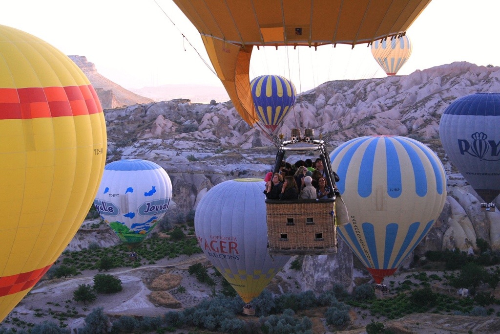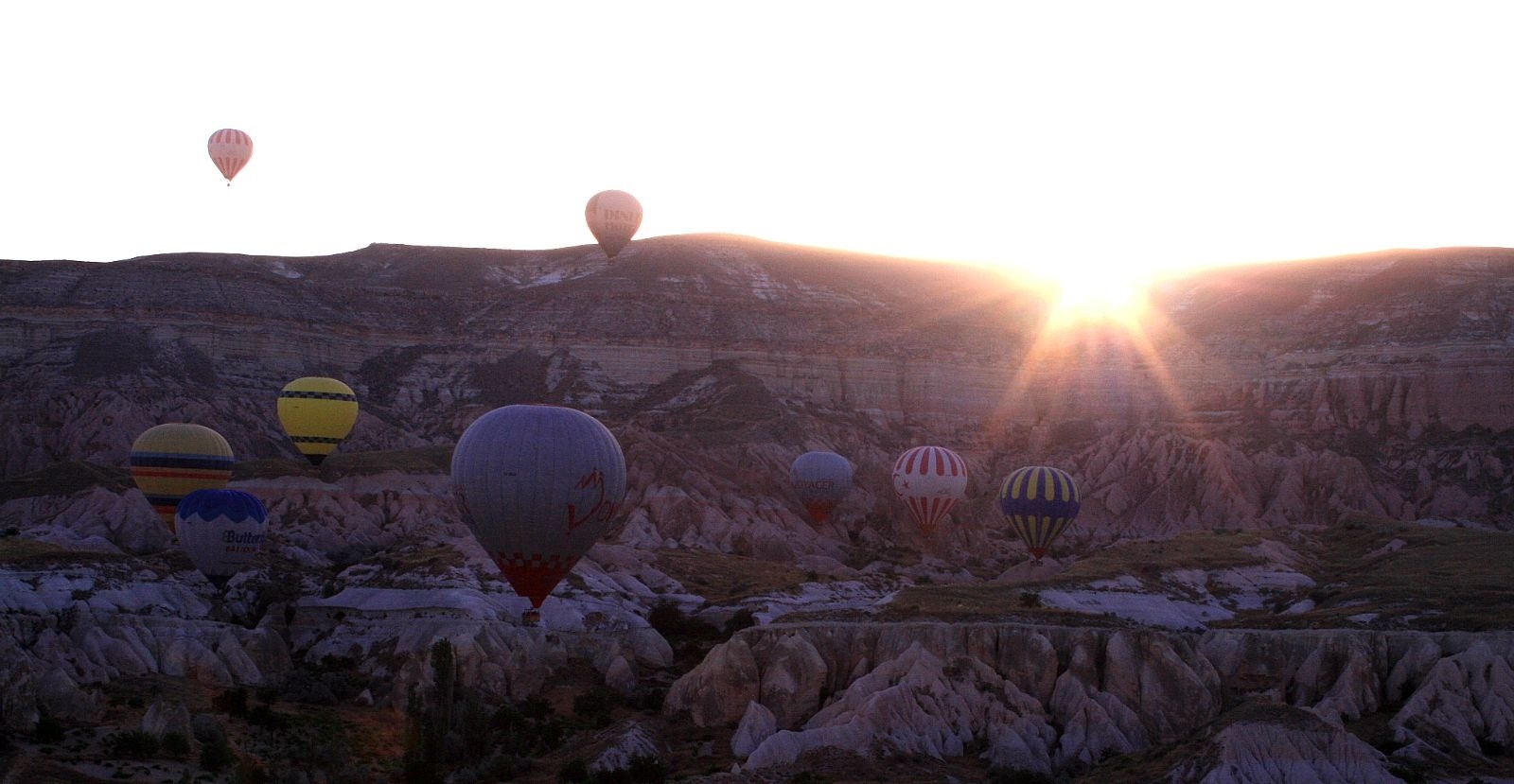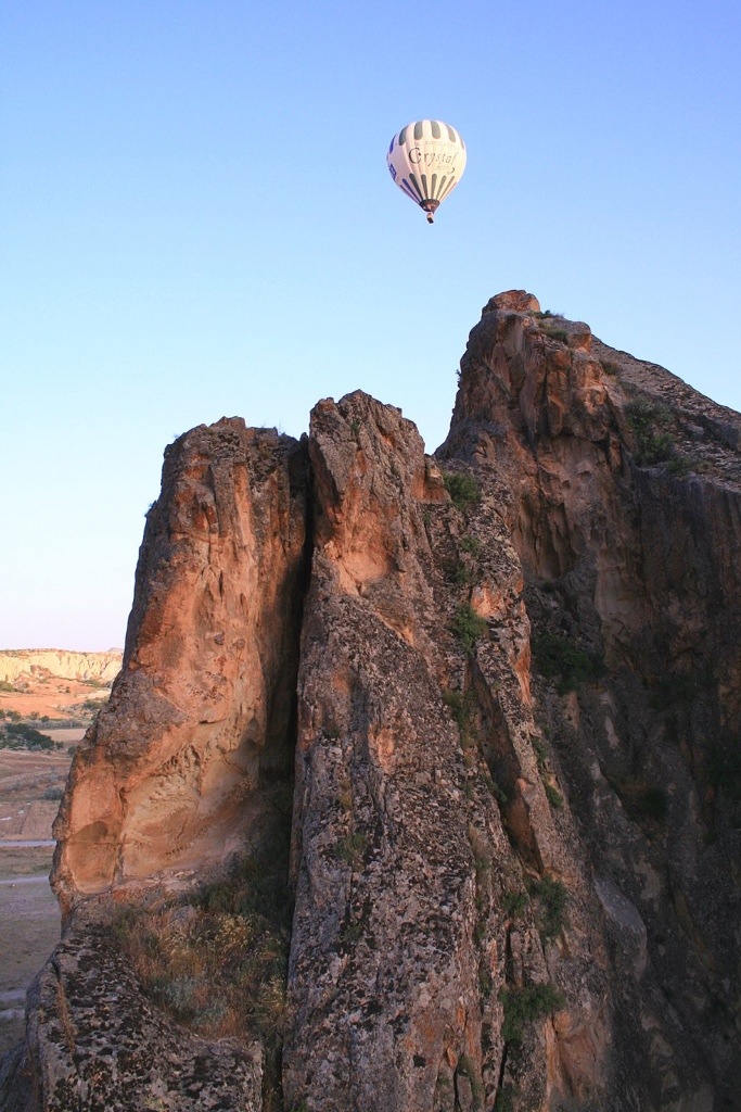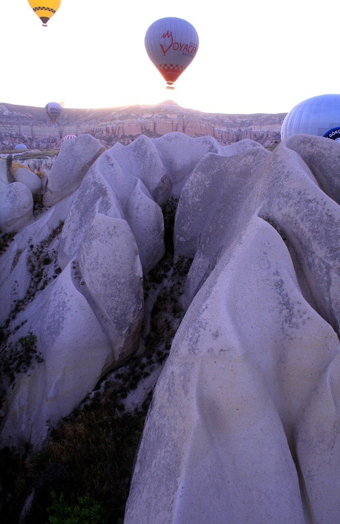 Our pilot is Turkish, the chief pilot of all the Royal Balloon pilots. Turns out he is also the air crash investigator for the recent balloon accident, so we feel in safe hands. Taking off at 5.40am, we see the dawn arrive over the large hill in the distance. It’s a brilliant sight travelling quietly over the valleys and fairy chimneys, the heat from the burner making the chilly morning suitably warm. Of equal majesty is the sea of balloons around us, 52 this morning; their colourful domes dancing in and out of the valleys.