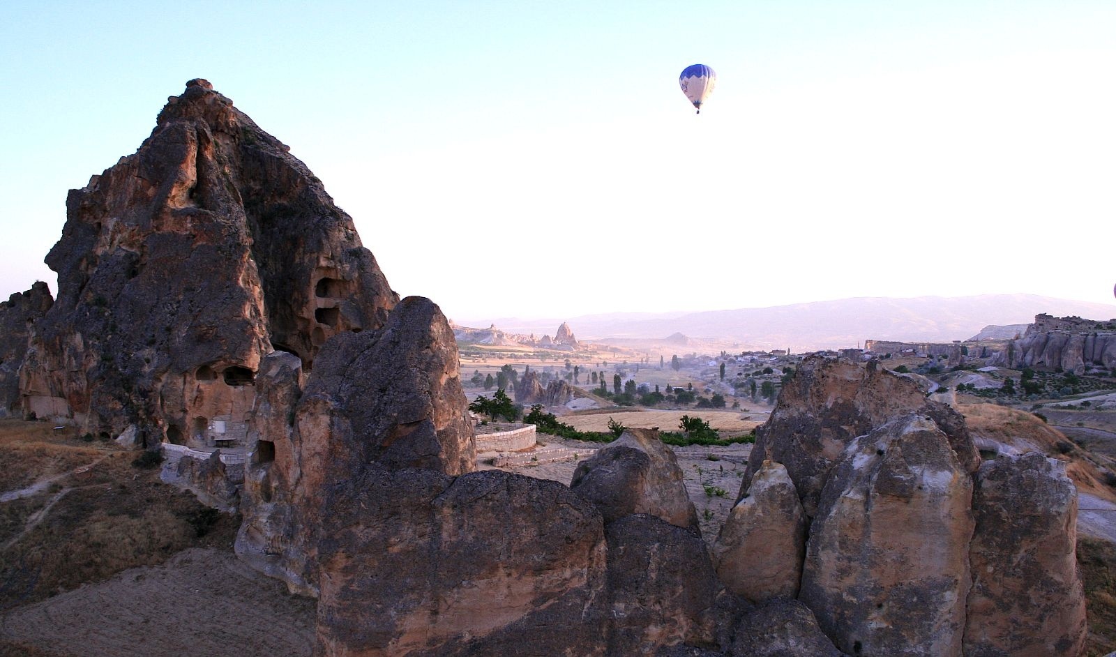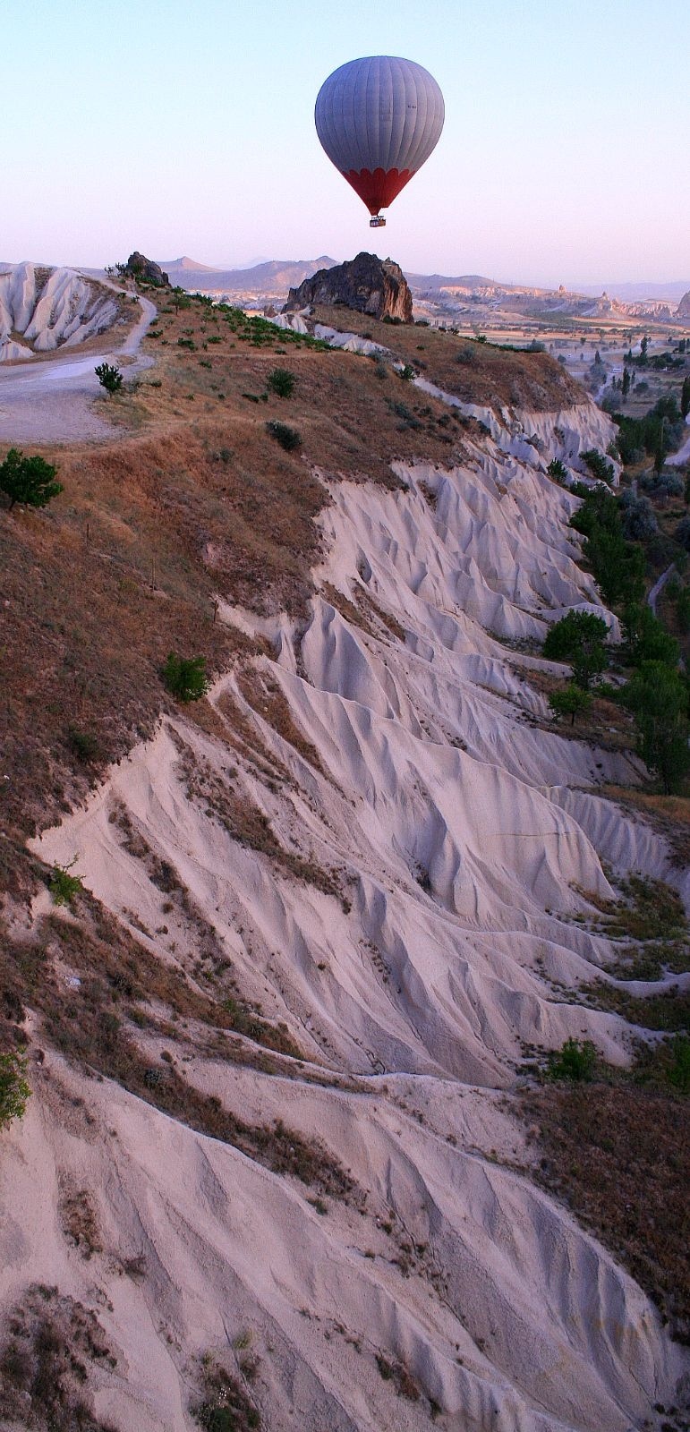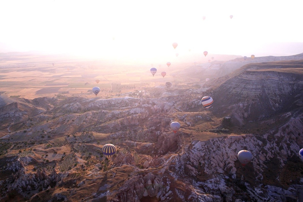Our pilot is Turkish, the chief pilot of all the Royal Balloon pilots. Turns out he is also the air crash investigator for the recent balloon accident, so we feel in safe hands. Taking off at 5.40am, we see the dawn arrive over the large hill in the distance. It’s a brilliant sight travelling quietly over the valleys and fairy chimneys, the heat from the burner making the chilly morning suitably warm. Of equal majesty is the sea of balloons around us, 52 this morning; their colourful domes dancing in and out of the valleys.