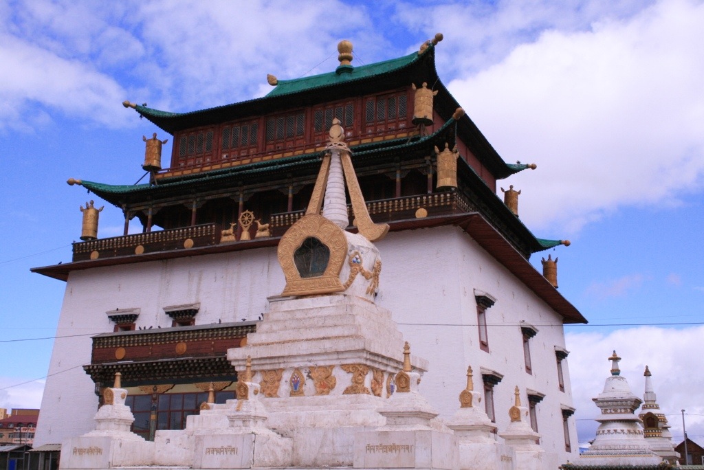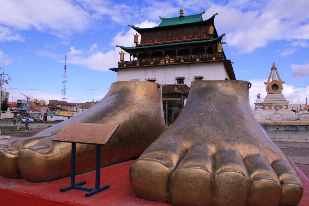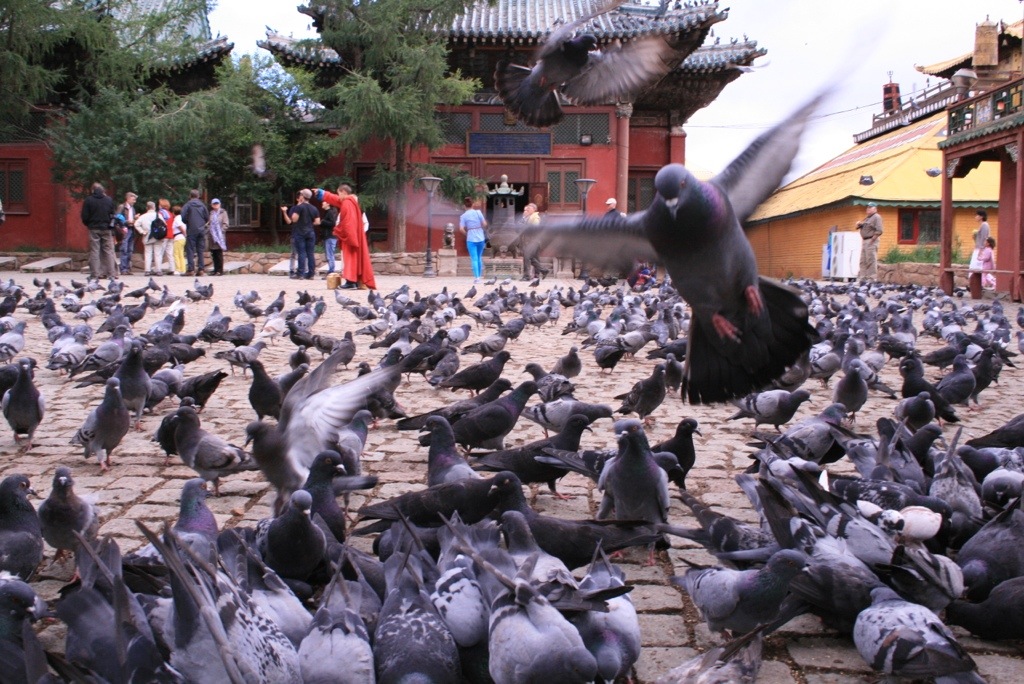 First stop was a local hotel for breaky (decor looked liked a 70’s wedding reception!), then off to Gandan Khiid Monestry! This was a beautiful collection of buildings and temples built in 1838, and has housed the 13th Dalai Lama, survived previous communist periods, and currently has 600 resident monks. We were greeted by HUNDRED’s of pigeons in the central courtyard, before entering one of the big temples and watching a chanting ceremony by the monks. It was intense – very loud with drums, huge trumpets, and of course chanting, the smell of incense, colourful flags and banners, and offerings of sculptures made out of butter and lots of chocolates!