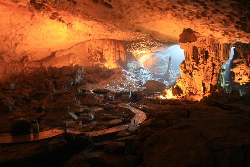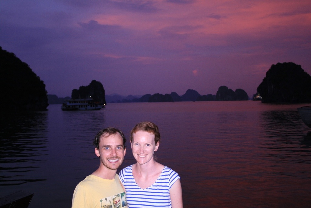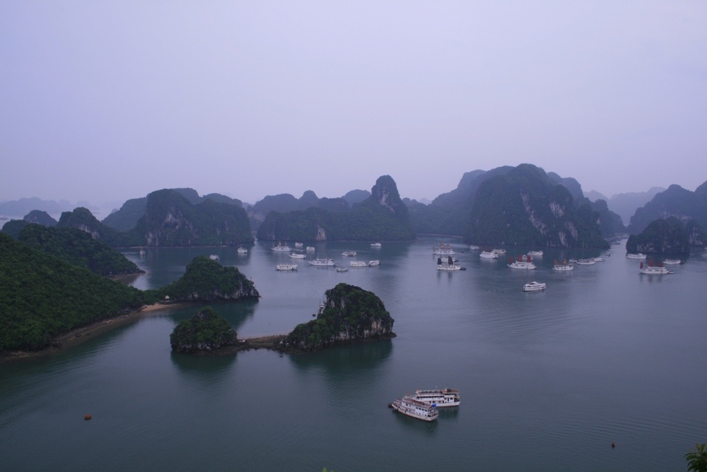 Scott : After a sleepless night – full on aircon with no sheet, we headed out early to catch the view from a high vantage point in Halong bay. Although a sweaty climb, the views were impressive; the limestone islands dotted as far as you could see. The mist slowly lifting as the morning wore on, revealing more ‘dragons’ emerging from the water.
