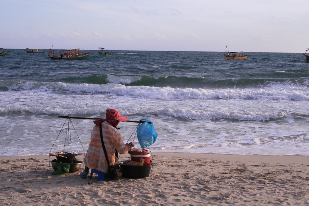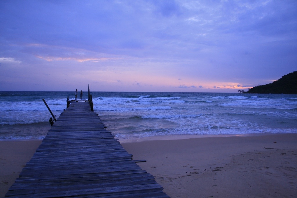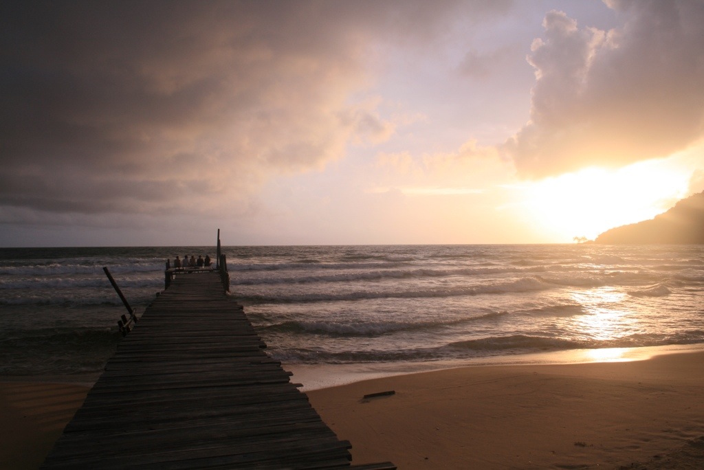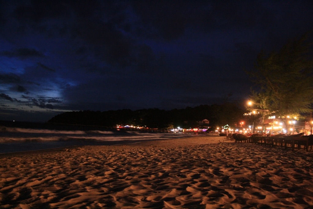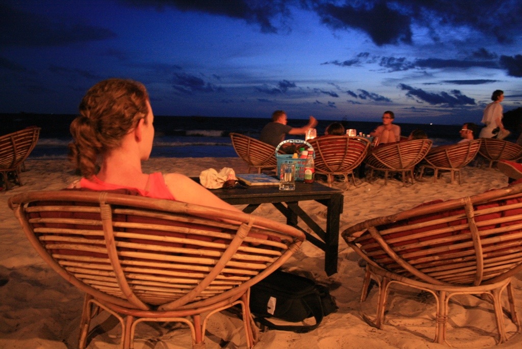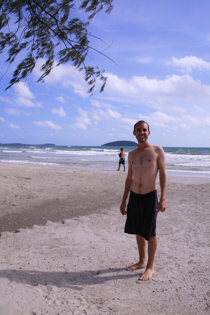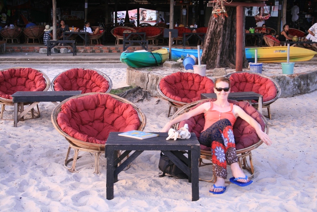 We arrived in Sihanoukville after an interesting bus ride from Kampot. Despite being a ‘direct’ bus we managed to pick up many locals on the way. My bag ended up with a huge colony of ants as local fruit was piled on top, and one lady forgot her baby food so we stopped on the side of the rode while someone caught up with us. Sihanoukville is a sprawling coastal town, a huge port to the north, and sheltered long white sandy beaches to the south. It’s a rapidly growing budget traveller hang-out, with a laid back approach, which has created a strip of neon-lighted seafood restaurants and bars along the beach. There were huge deck chairs covering the beach, selling cut price draft beer and BBQ seafood.