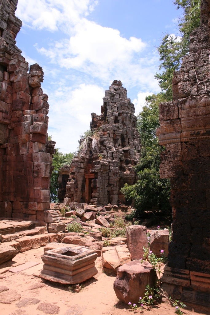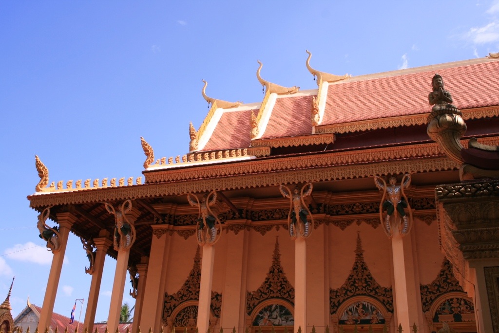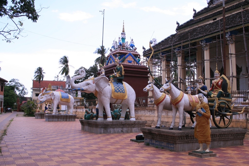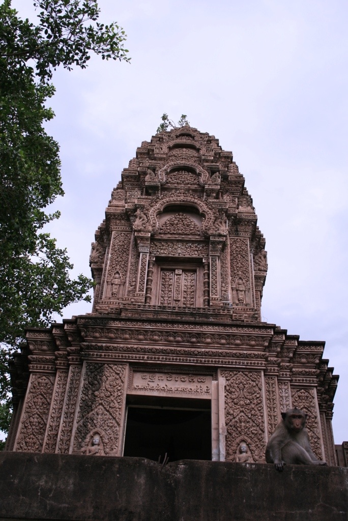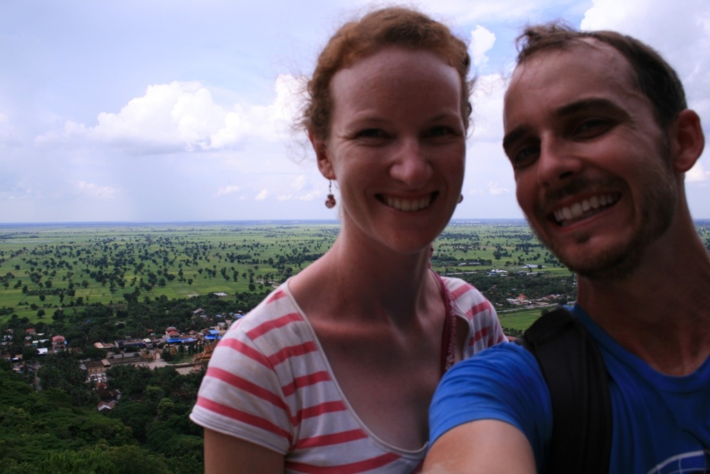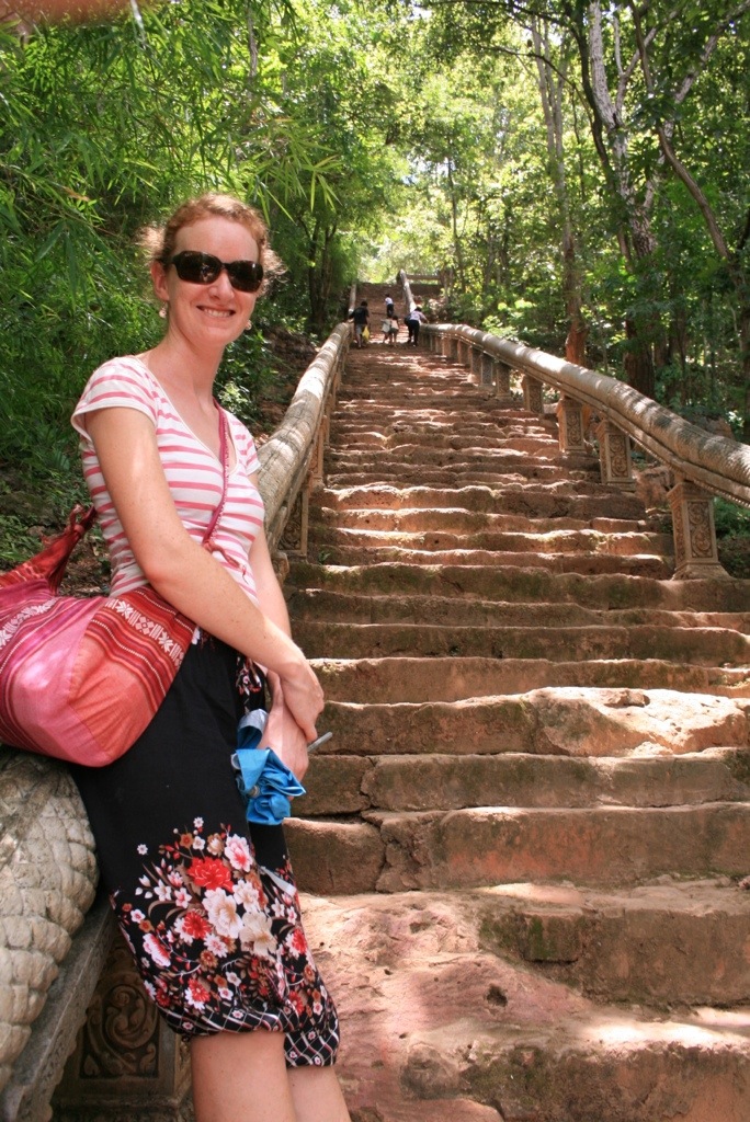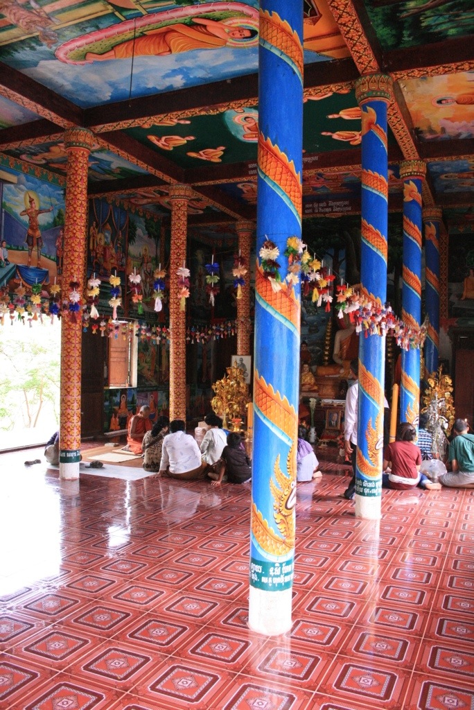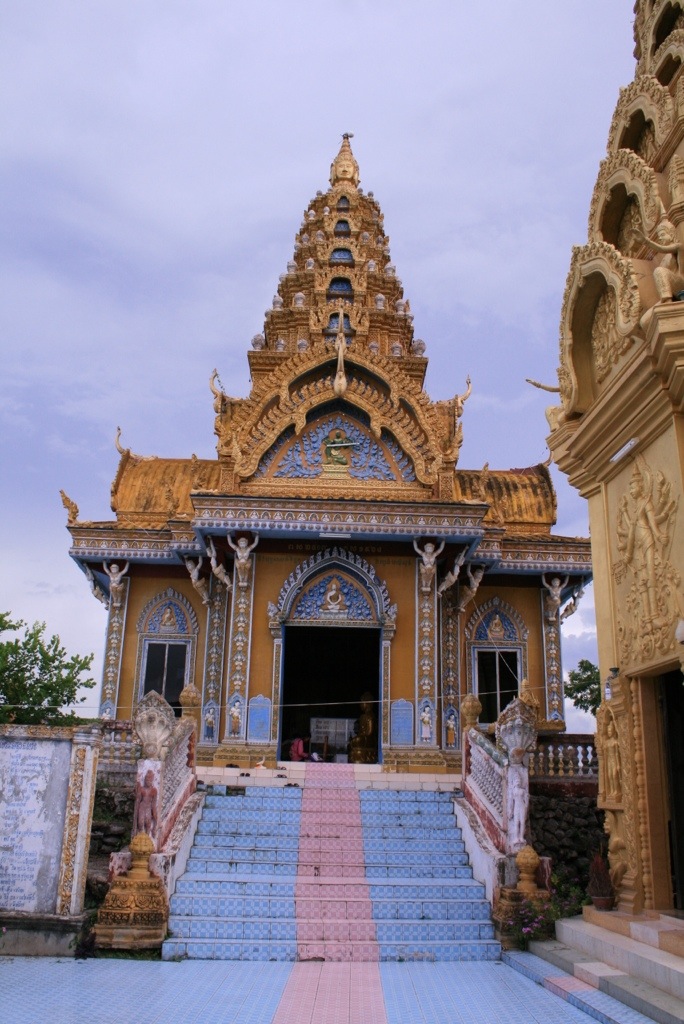 There are many temples scattered around Battambang, some quite impressive set on top of small hills (or mountains as they call them!). The first one, Phnom Banan, was on top of a hill, up 358 very steep, old and kind of crumbly steps (we were thankful for the cool breeze at the top!). The temple at the top has five towers, a couple of which are still active. I didn’t walk through temple as they looked so crumbly and unstable, with a large pile of blocks in the middle where stone had already fallen. We had a quick and yummy roadside lunch of fried rice before continuing on to Phnom Sampeau, a complex of temples sitting on top of a limestone outcrop. We hired a teenager boy to guide us through the many tracks up/down/around the mountain. It was a half hour steep climb to the top, stopping halfway to look at another temple, and the ‘Killing Caves’, where many were killed by being thrown down a cave shaft during the Khmer Rouge reign. Scott went into the cave, I’m glad I chose to stay at the top and miss seeing the cabinet of skulls at the bottom. At the top, we were greeted by many macaques, sizing us up for food, even though they were holding handfuls of peanuts stolen from the local store. The views at the top were incredible, stretching far across the flat green rice paddies to the horizon. These temples were busy and still active as well, one bright gold one and a couple of colourful mosaic temples.