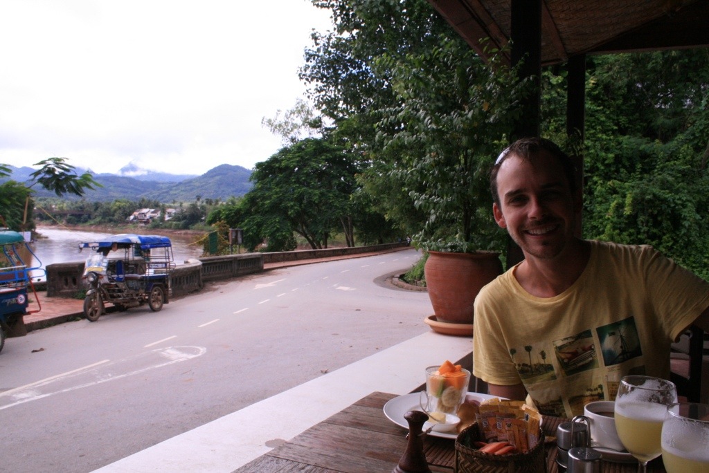 Having woken up in a nice guesthouse for my upcoming birthday, we had a lazy morning, enjoying some Lao coffee and pancakes by the river. The city of Luang Prabang is focused around the ‘old town’ a small peninsula created by the convergence of a Mekong tributary (Nam Khan) with the main river. It serves as the home of Buddhism in Laos and was the capital until the rise of communism in the 1970. The combination of beautiful monasteries and old French colonial architecture has made the centre of town a UNESCO heritage site.