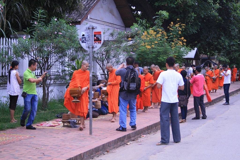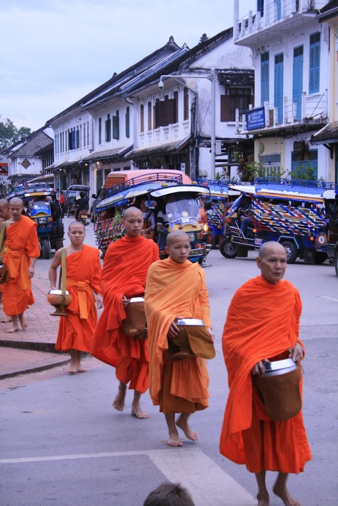 The following morning, we awoke at 5.45am to witness the Buddhist monks receiving alms – an age old tradition where the monks receive their daily food offers from the local residents. We had mixed feelings about witnessing the ceremony, as rampant group tourism in Lao had converted the deeply religious ceremony to a garish tourist side show. Despite many warnings around town we found large groups of Asian tourists taking intrusive picture, following the monks in TukTuk’s and resort electric carts and generally disturbing the tranquility of a peaceful daily event. I had taken a few photos from a distance but soon put my camera away – disgusted at the bastardisation of this symbolic event. Similarly, westerners joined in the offering, buying low grade rice and cakes advertised as ‘pre made alms packages’ from persistent hawkers on the side lines for highly inflated tourist prices.